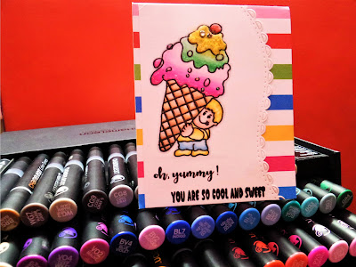 Today's card is ice-cream cone inspired including every tiny detail..... the colorful striped PP, cool sentiment and yummylicious multilayers in summer cool colors!